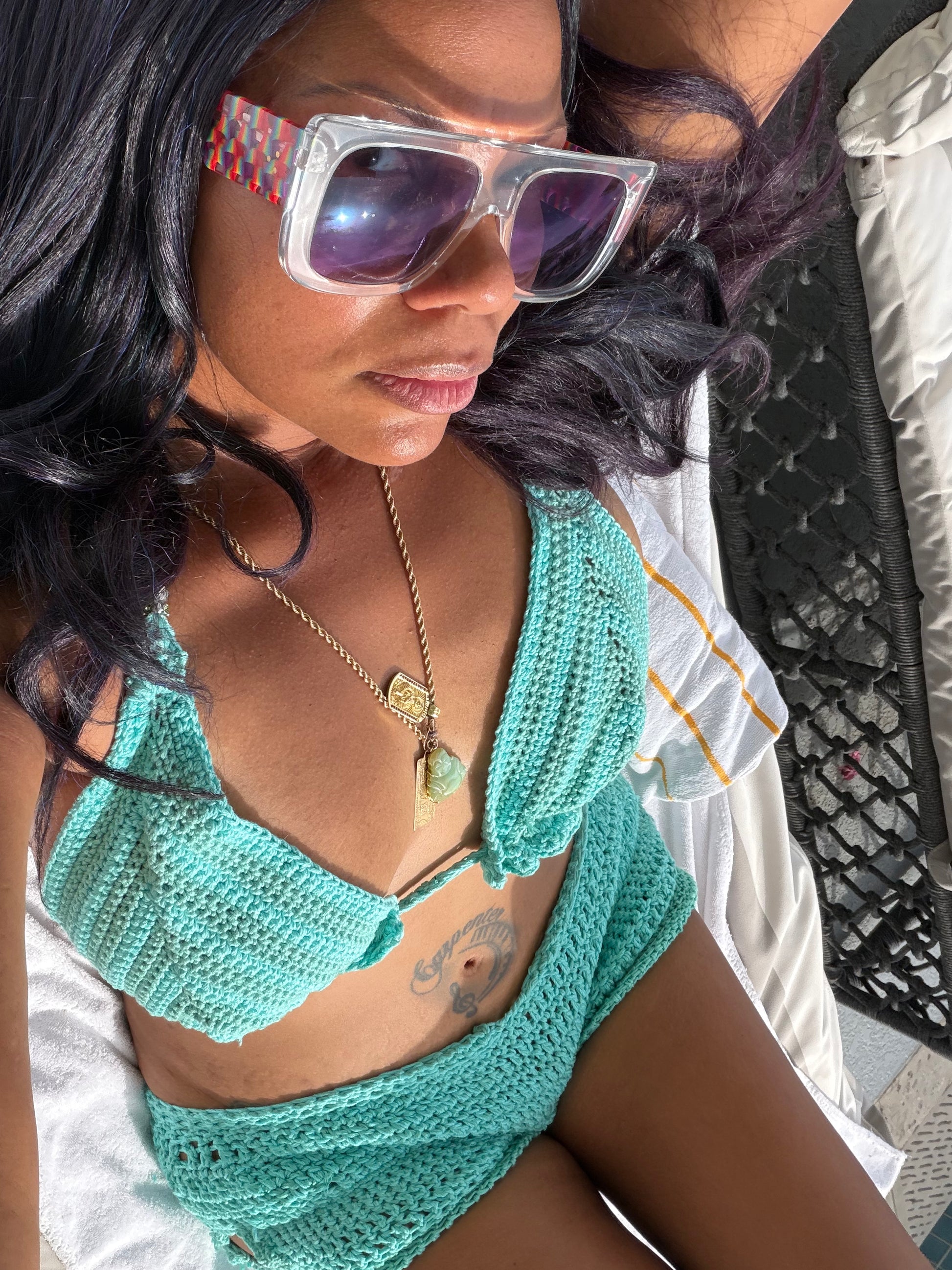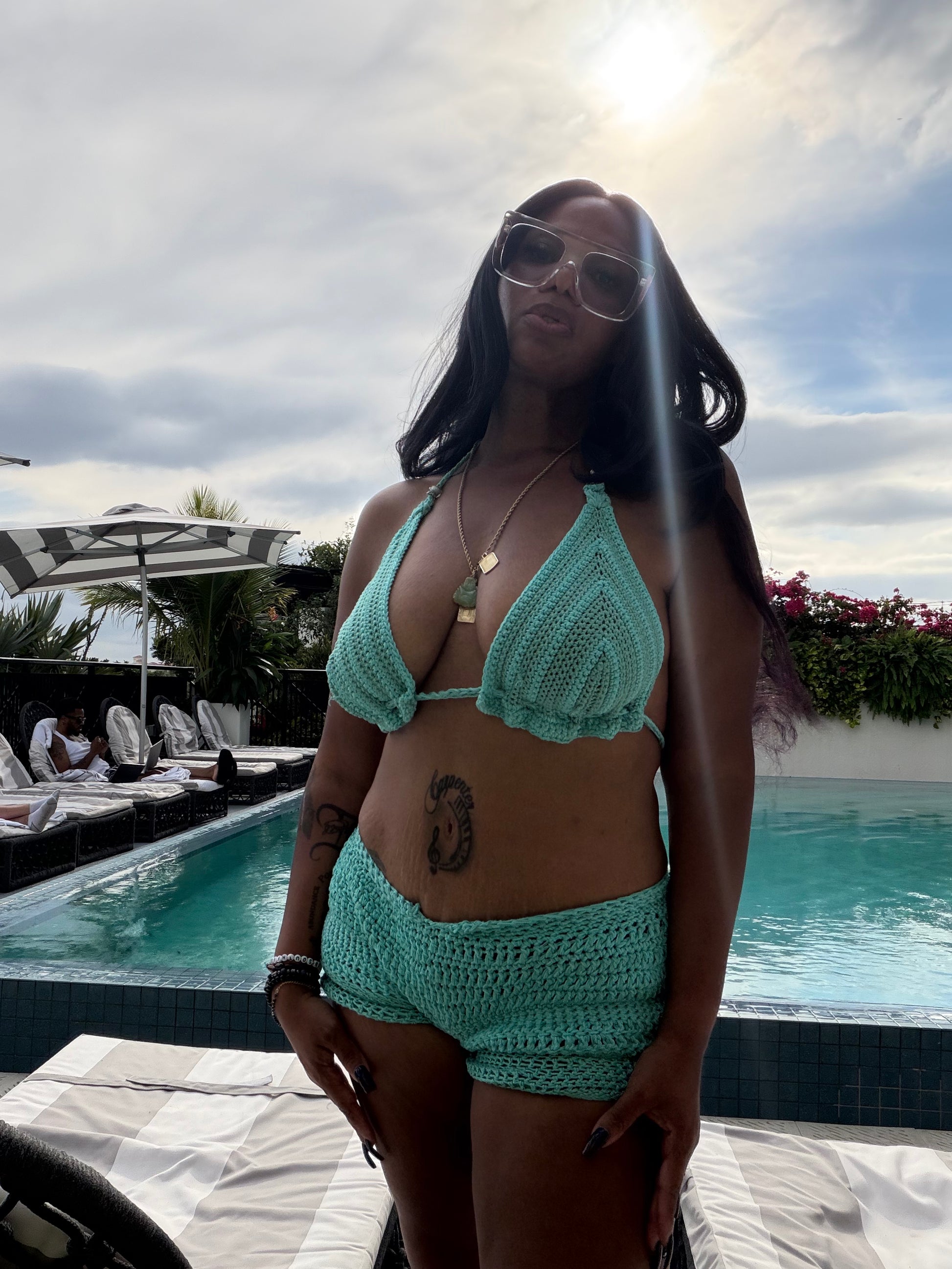 Handmade with 100% cotton, the Aqua Serenity bikini embodies calm confidence and divine strength. Its ocean-inspired hue and soft crochet texture blend elegance with empowerment — a reminder that peace is powerful.